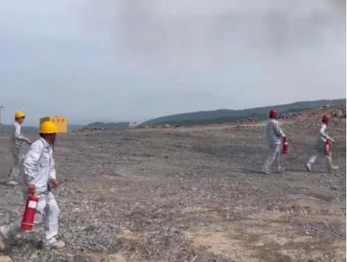 此次演練,災(zāi)情設(shè)定挖掘機(jī)在進(jìn)行焊接作業(yè)時(shí),焊接火花飛濺引燃一旁維修時(shí)使用的擦拭油料的棉紗,由于維修位置靠近清表時(shí)砍伐的樹(shù)木且臨近礦區(qū)邊緣林區(qū),由于當(dāng)天風(fēng)勢(shì)較大待發(fā)現(xiàn)時(shí)被砍伐的樹(shù)木已被引燃且火勢(shì)洶涌,發(fā)現(xiàn)火災(zāi)事故的員工立即通知帶班領(lǐng)導(dǎo)。帶班領(lǐng)導(dǎo)接到報(bào)告后,立即啟動(dòng)應(yīng)急預(yù)案,組織人員進(jìn)行滅火。