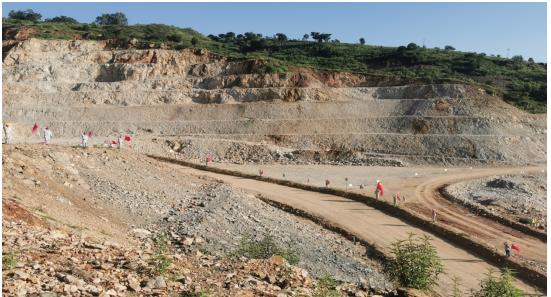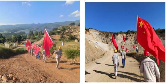 唱完國歌,員工們在項(xiàng)目經(jīng)理及各黨員的帶領(lǐng)下,每人領(lǐng)取了一面國旗和旗桿,興致勃勃的向礦區(qū)走去。
